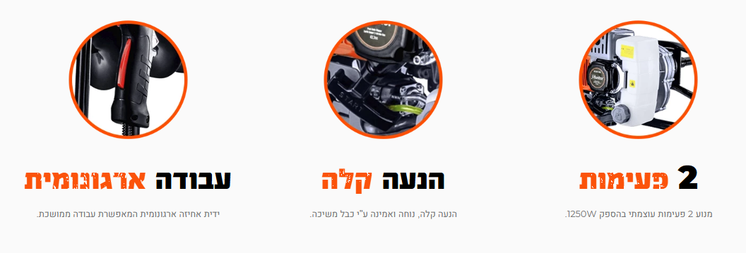 * מיכל דלק מרווח: נפח של 1.2 ליטר מאפשר עבודה ממושכת ללא צורך בתדלוקים תכופים.