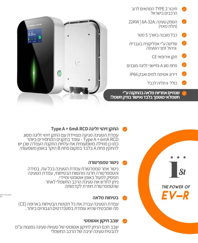- עמדת טעינה עם חיבור Type 2 המתאימה לרוב סוגי הרכבים הקיימים בישראל