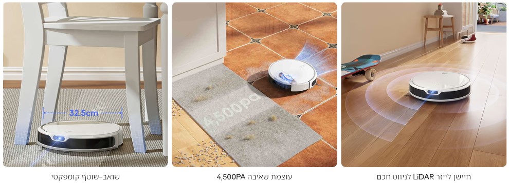 התאמה למכשולים – מאפשר תנועה חכמה בין רהיטים, קירות ומכשולים אחרים ברחבי הבית.