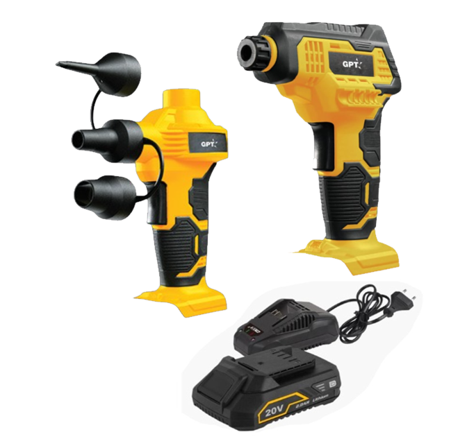 מנפח מזרונים עוצמתי במתח 20V, עם לחץ אוויר מקסימלי של 0.5PSI וקצב ניפוח של 45 מ"ק לשעה.