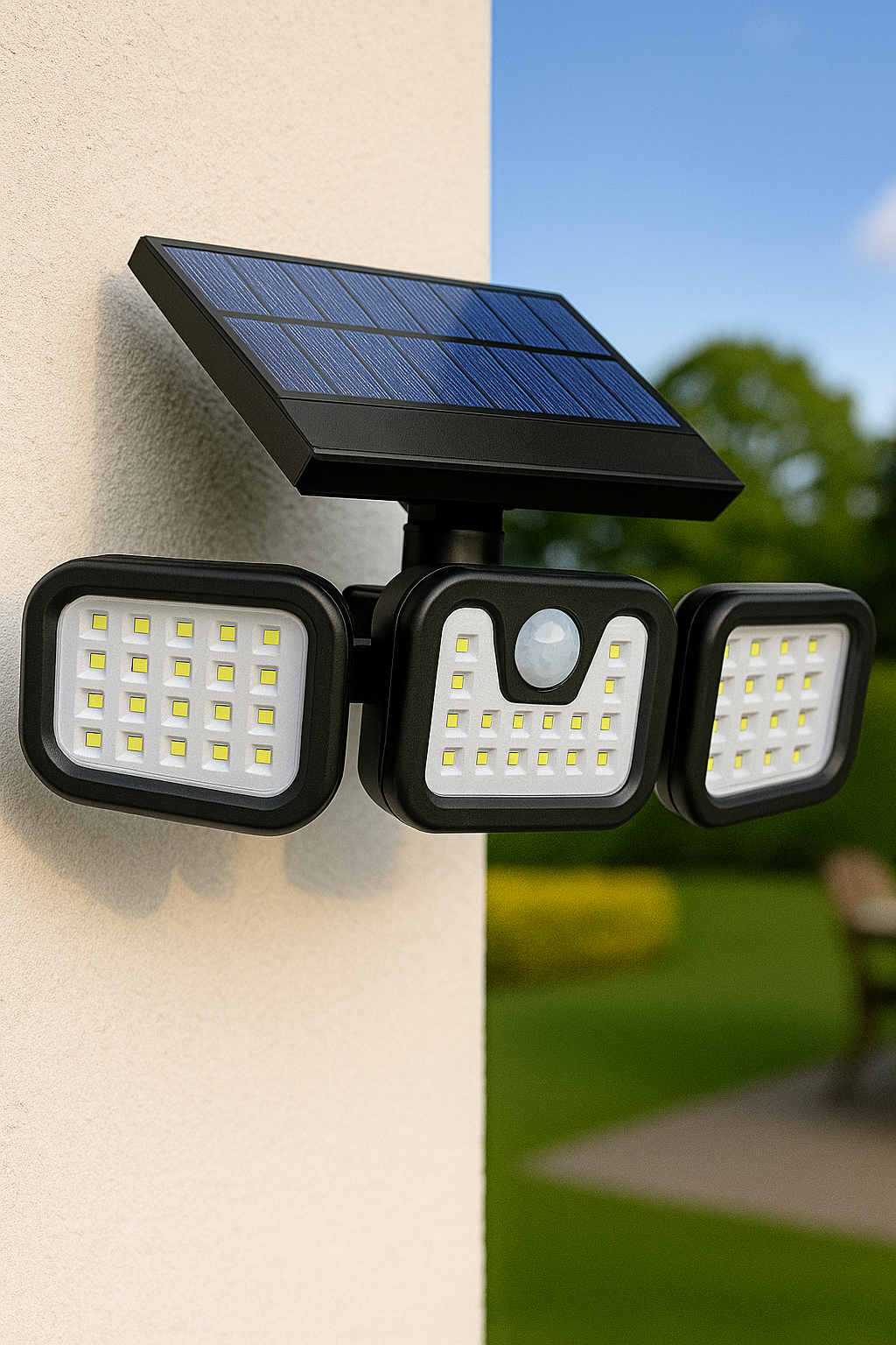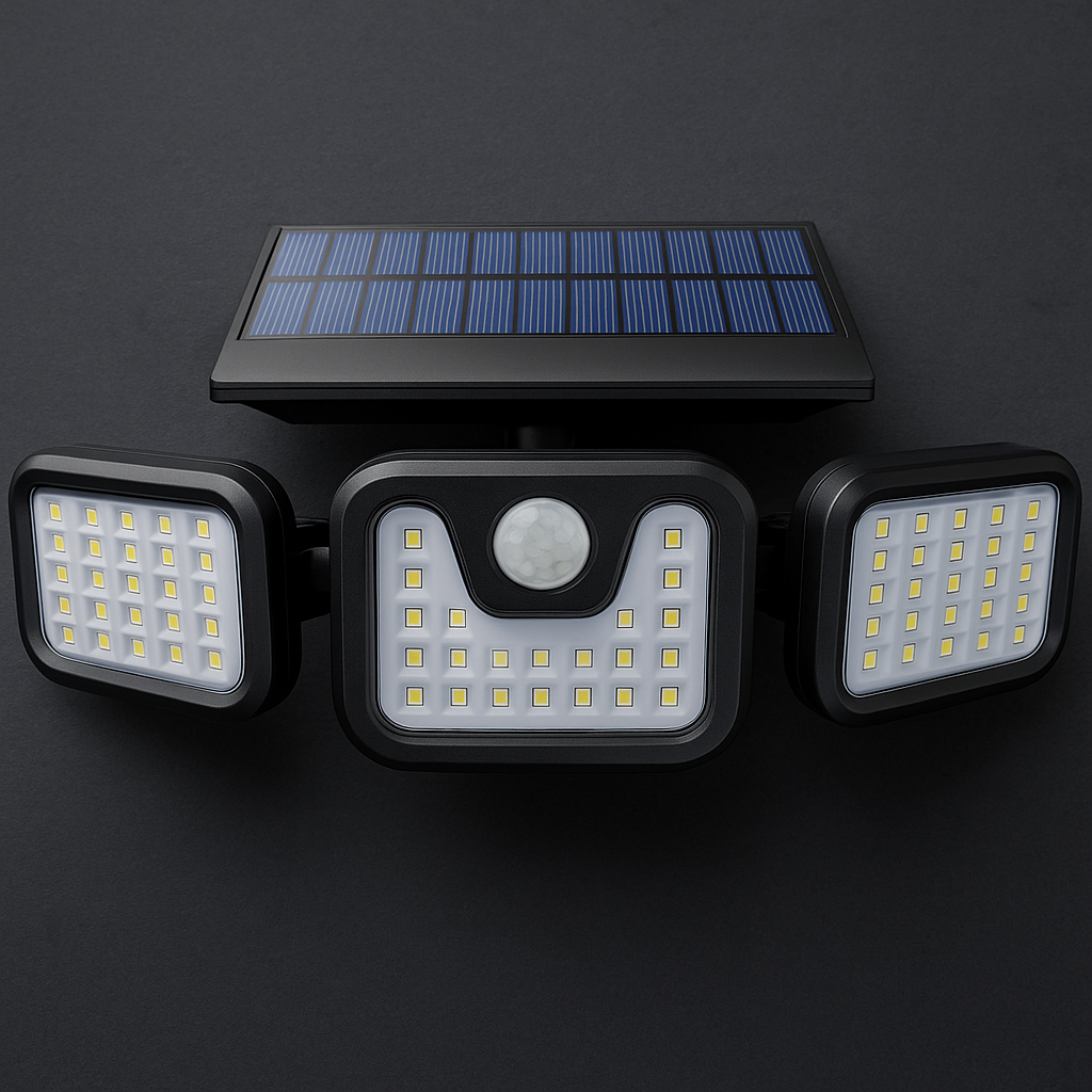 תאורה סולארית עוצמתית עם שלושה פנסים נפרדים, חיישן תנועה חכם ויכולת פעולה במצבים משתנים – פתרון מושלם לתאורת חוץ באזורים ללא חשמל, כולל חנייה, שבילים, גינות ומחסנים.