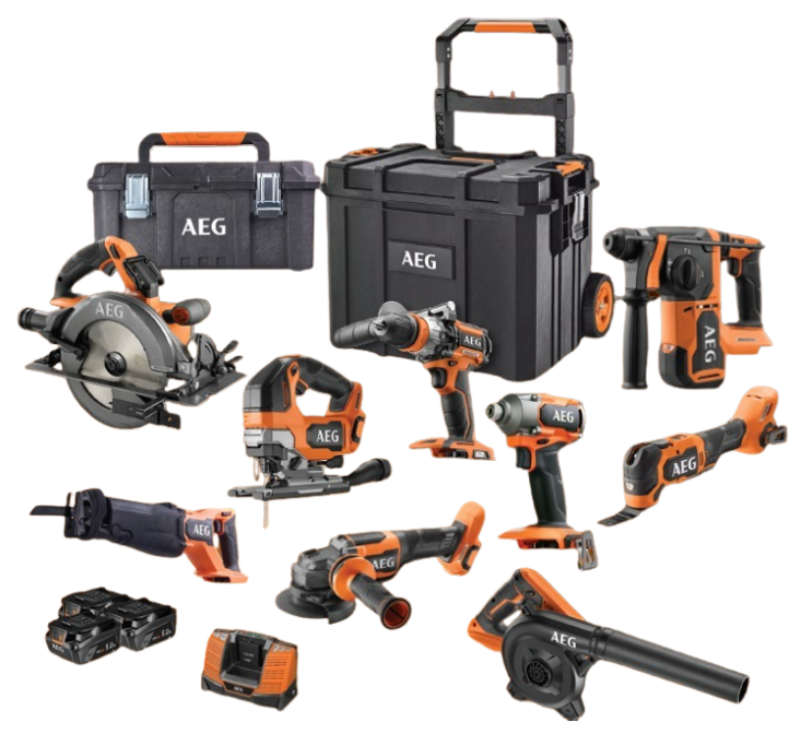 סט מקצועי הכולל 9 כלים נטענים 18V מסדרת BRUSHLESS מבית AEG, עם 3 סוללות 5Ah, מטען מהיר, עגלת נשיאה וארגז אחסון – פתרון מושלם לכל משימת עבודה בבית ובאתר.