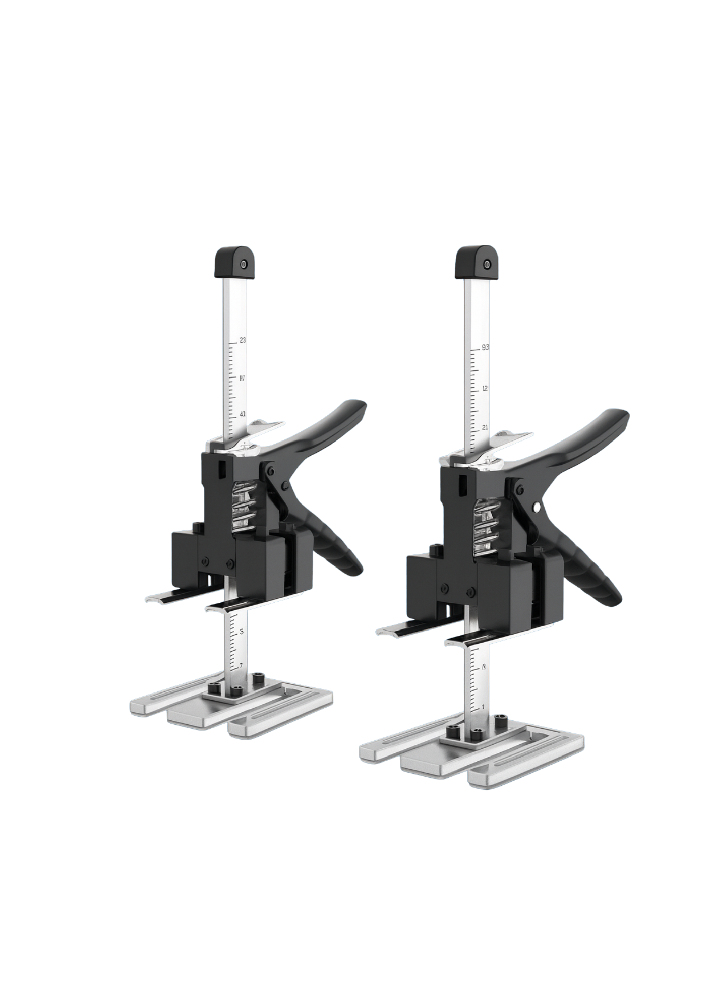 זוג מתקני פילוס והרמה מקצועיים לעבודה מדויקת עם קרמיקה, לוחות גבס, ארונות ועוד - עשויים מפלדה חזקה במיוחד לעמידות גבוהה ושימוש ממושך.