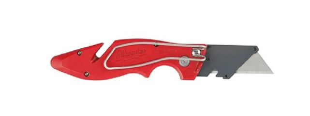 סכין טרפז מתקפלת מסדרת FASTBACK מבית MILWAUKEE, דגם 48-22-1901 – סכין חזקה, מהירה ויעילה עם מנגנון פתיחה ביד אחת, להחלפה מהירה של להבים ועיצוב עבודה מקצועי.