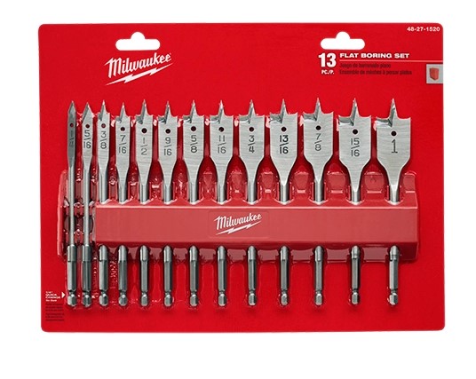 סט כפות הקידוח השטוחות של Milwaukee מסדרת 48-27-1520 כולל 13 גדלים שונים המאפשרים התאמה מלאה למגוון רחב של עבודות קידוח בעץ.