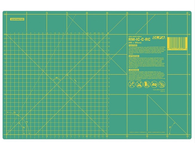 משטח חיתוך דו‑צדדי OLFA RM‑IC‑C — משטח איכותי לעבודה עם סכינים וגלגלות, עם גריד לס״מ ואינצ׳ים, ושכבת חיתוך מתרפאת לשימוש ארוך‑טווח.