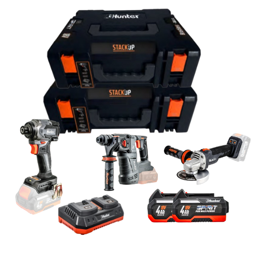 סט קומבו מקצועי מסדרת Hunter STACKUP 18V עם מנועי Brushless (ללא פחמים) לעבודה יעילה וחזקה לאורך זמן.