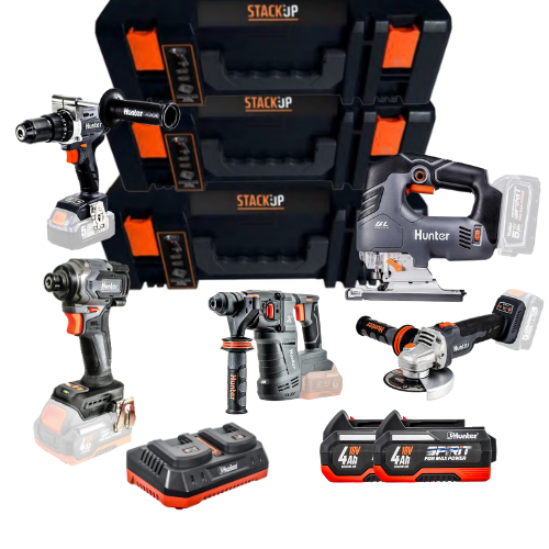 סט קומבו מקצועי Hunter STACKUP 18V Brushless 5 ב-1 הכולל פטישון, אימפקט, משחזת זווית, מסור אנכי ומברגה/מקדחה – עם 2 סוללות 4Ah, מטען כפול, 3 ארגזי כלים ומברגה דופקת. פתרון מלא לעבודות התקנה, שיפוץ ותחזוקה.