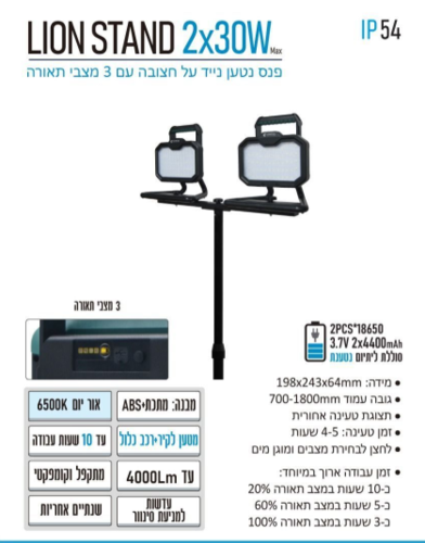 פנס הצפה LED נטען Omega Lion Stand 2×30W – מערכת תאורה ניידת עם שני פנסי LED חזקים ועמוד טלסקופי, אידאלית לשטח, עבודות ותחזוקה.