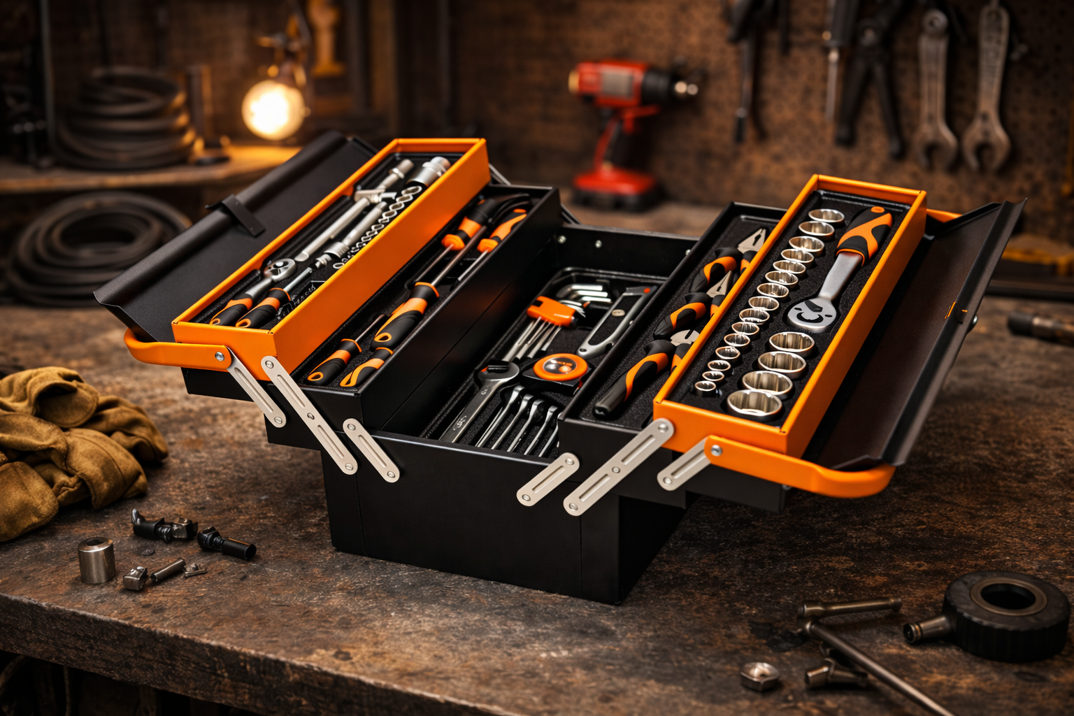 הסט כולל מגוון רחב של בוקסות, מברגים, מפתחות ופליירים, המותאמים לעבודה עם מגוון ברגים ואומים.