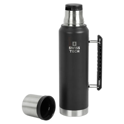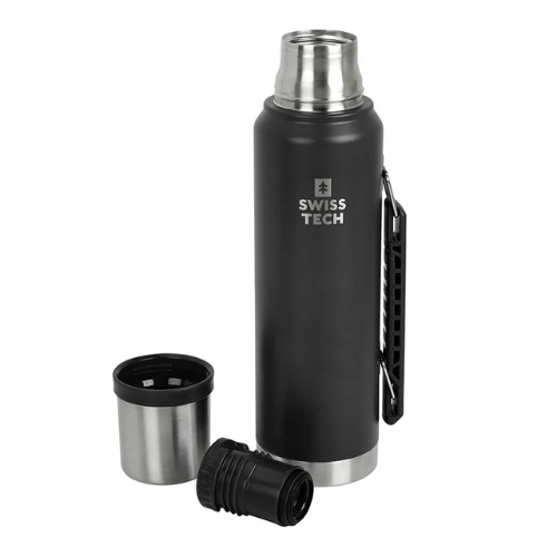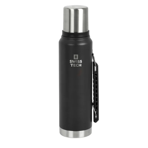 בקבוק שתייה תרמי Swiss-Tech ST076007 בנפח 1182 מ״ל, בצבע שחור עם עיצוב פרקטי לשמירה על טמפרטורת משקאות חמים וקרים — פתרון איכותי לימי עבודה ארוכים, נסיעות, טיולים ופעילות חוץ.