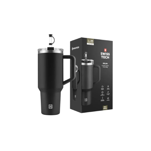 בקבוק שתייה תרמי Swiss-Tech ST078109 בנפח 1180 מ״ל בעיצוב שחור-כסוף איכותי — פתרון פרקטי לשמירה על חום וקור של משקאות לאורך כל היום, מתאים לשימוש יומיומי, נסיעות, עבודה וטיולים.