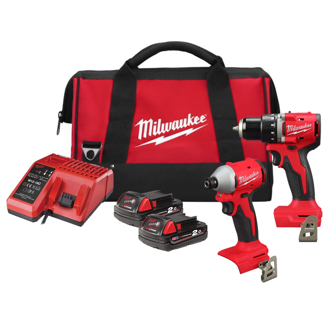 סט נטען מקצועי Milwaukee M18 הכולל מקדחה/מברגה ומברגת אימפקט מסדרת Brushless, עם שתי סוללות 2.0Ah, מטען ותיק נשיאה. פתרון מושלם לעבודות קידוח, הברגה והתקנות ברמה מקצועית.