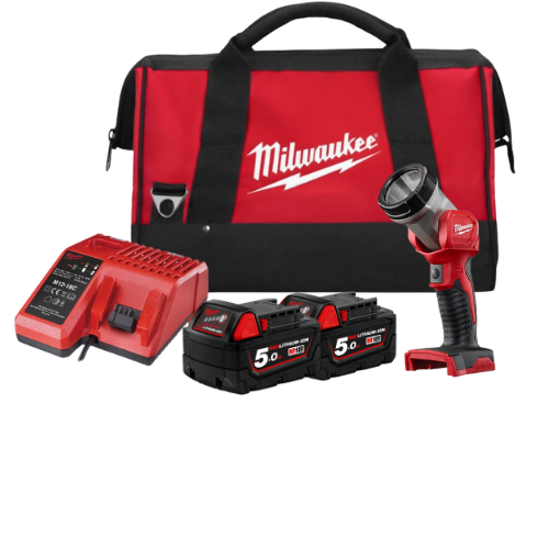 סט מקצועי הכולל פנס עבודה נטען 18V Milwaukee יחד עם 2 סוללות 5.0Ah, מטען ו־תיק נשיאה – פתרון תאורה קומפקטי ונוח לתנאי עבודה קשים, עם תאורת TRUEVIEW איכותית, ראש מסתובב 90° וו תלייה מובנה לעבודה ללא ידיים.