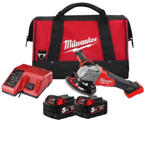 סט מקצועי הכולל משחזת זווית נטענת Milwaukee M18 FSAG125X בקוטר 125 מ״מ עם מנוע Brushless, יחד עם זוג סוללות 5.0Ah, מטען ותיק נשיאה — פתרון מושלם לחיתוך והשחזה בשטח ובסדנה.
