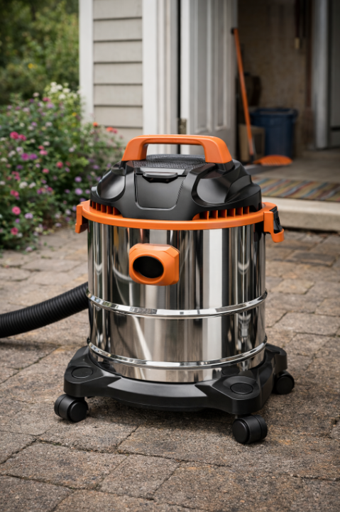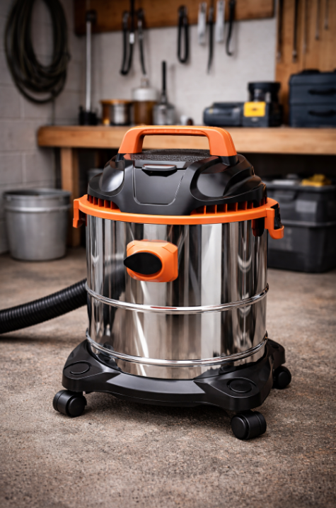 שואב אבק תעשייתי חזק בהספק 1500W לניקוי יבש ורטוב עם מיכל 25 ליטר, פונקציית נשיפה ואביזרי ניקוי מלאים – מתאים למוסכים, סדנאות ואתרי עבודה.